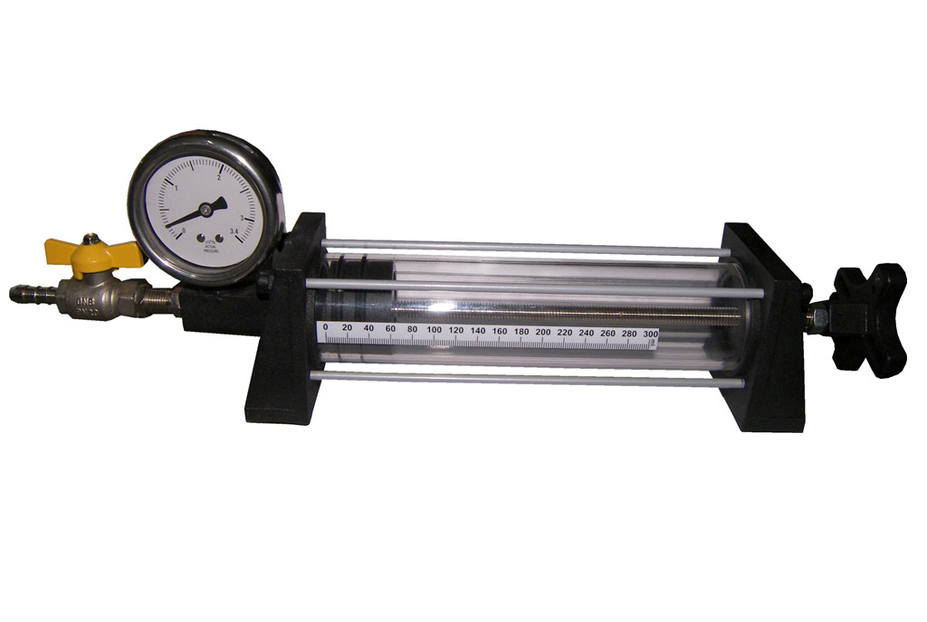 A horizontally mounted acrylic tube having a graduated scale (0-300cm3) along one side. A gas tap closes the tube. Pressure gauge is present next to gas tap. By changing the position of rubber stopper, the effective length of the tube can be selected. The scale measures volume and pressure by means of pressure gauge. Boyle’s law is investigated by changing position of the stopper. The relation PV=Constant , can be obtained by means of this apparatus at constant temperature .