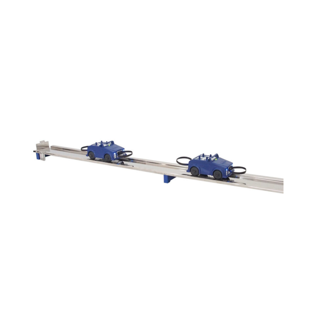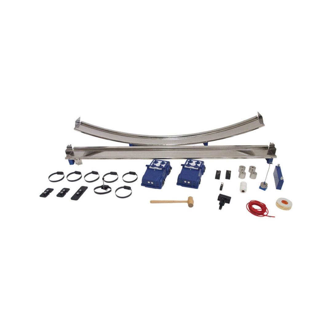 Experiments can be conducted on a high-quality 1.5m stainless steel track, which can also be inclined to serve as a ramp. For circular dynamics studies, a separate curved track is available, enabling users to graph damped simple harmonic motion and calculate the value of ‘g’ as an alternative to traditional g by free fall setups.